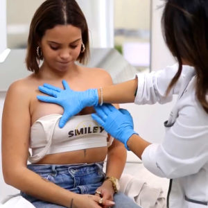 Durante esta valoración, la doctora procedió a probarle varios implantes de un volumen proporcional a su tórax para garantizar un resultado más armónico para su pecho y escote.