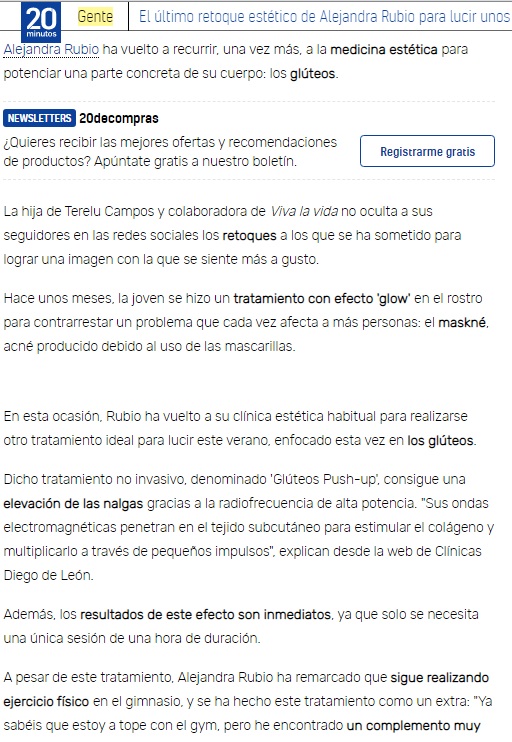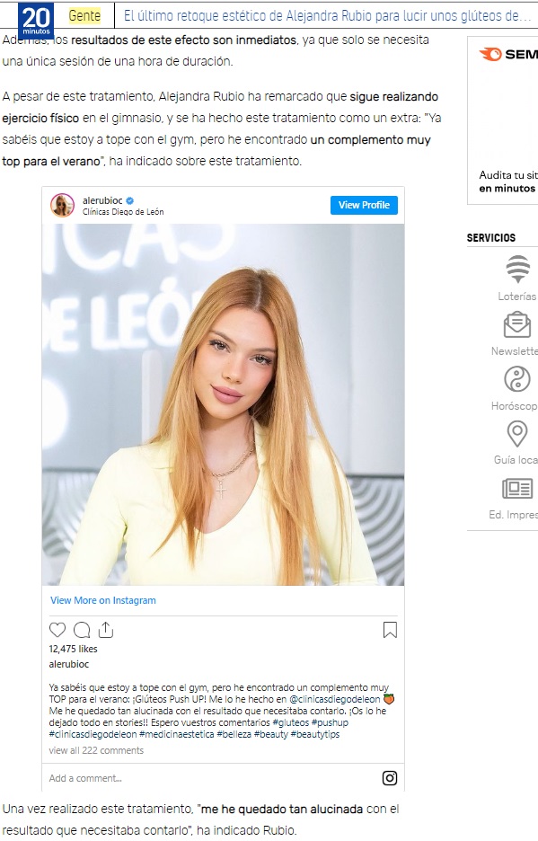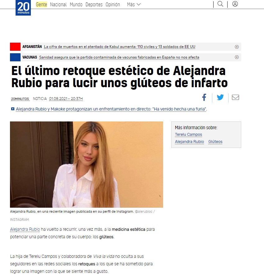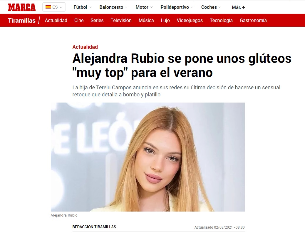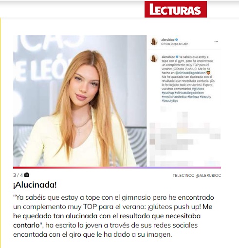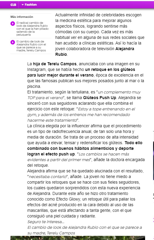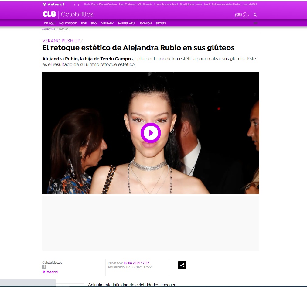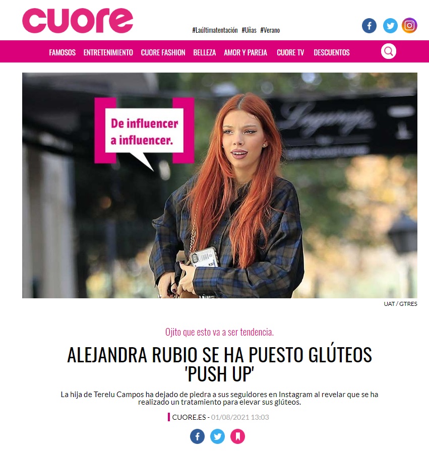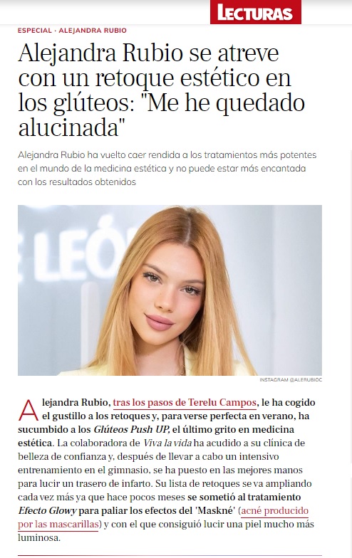 A nuestra paciente Alejandra Rubio le encanta compartir sus #BeautyTips. Y el último: sus “GLÚTEOS PUSH UP” ha revolucionado los medios de comunicación. ¡No te pierdas esta selección de titulares!