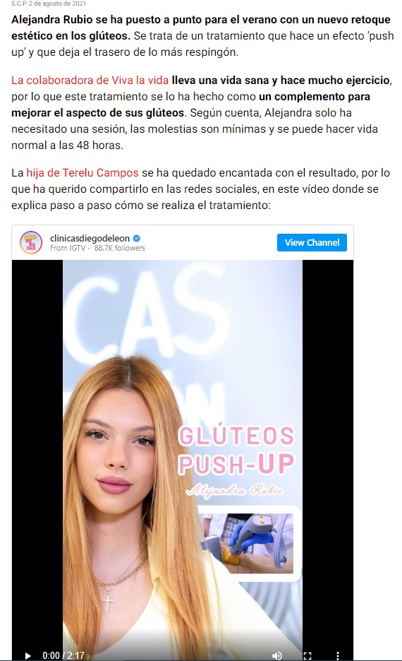 EL MUNDO: ALEJANDRA RUBIO, HIJA DE TERELU, SE PONE GLÚTEOS PARA EL VERANO: “ME HE QUEDADO ALUCINADA”
