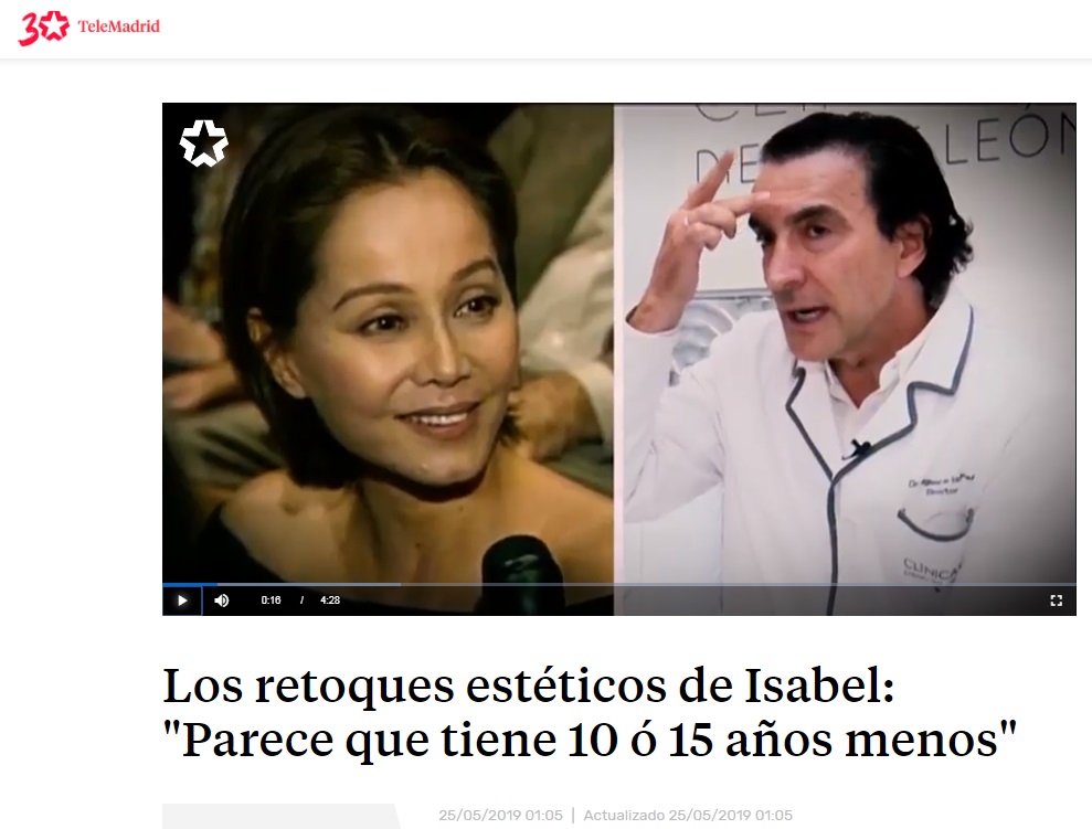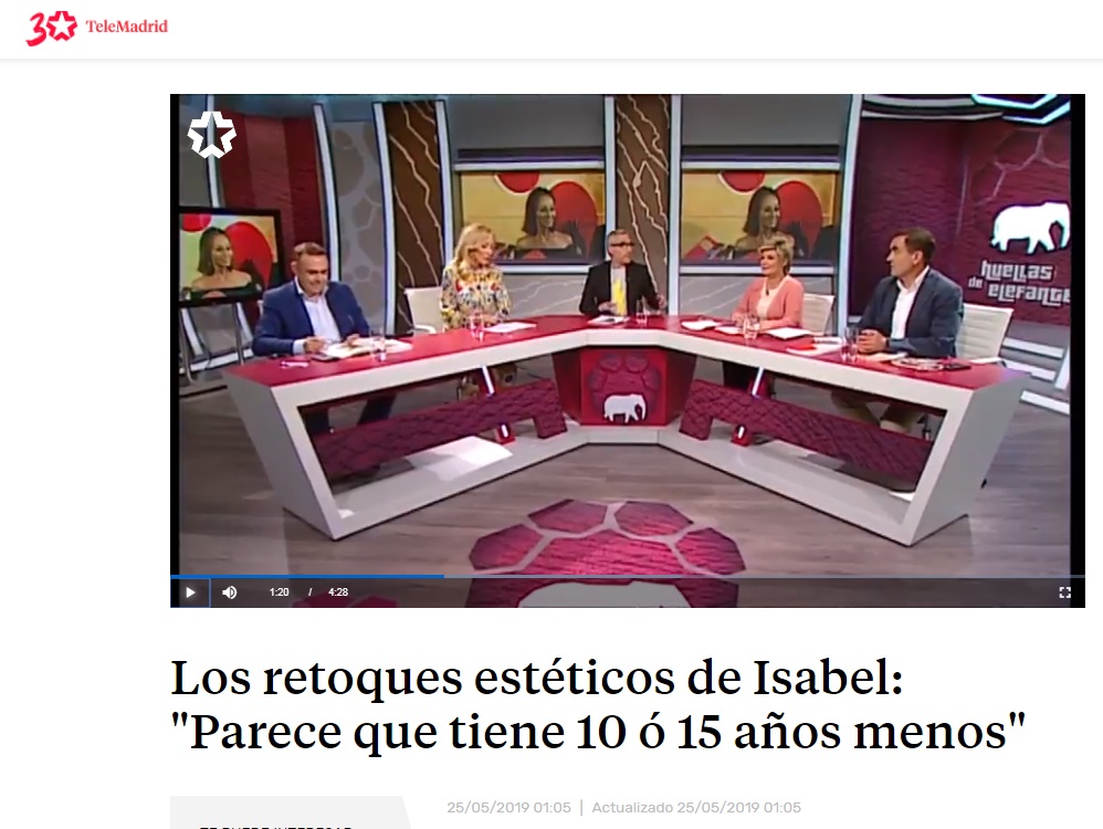El programa Huellas de Elefante que se emite todas las semanas en Telemadrid ha contado con el doctor Miguel de la Peña, director de Clínicas Diego de León, para analizar los retoques estéticos de la reina del papel cuché, Isabel Preysler.