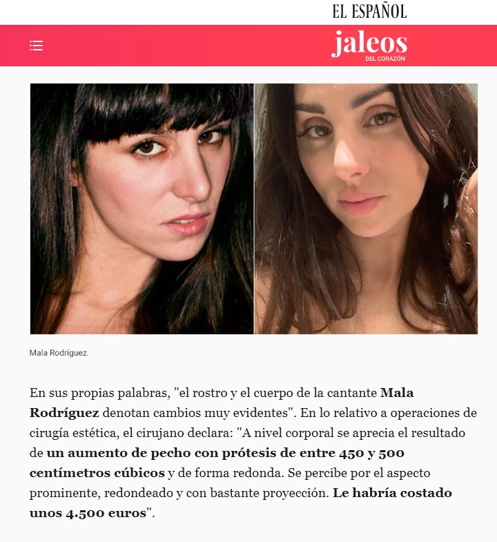 En sus propias palabras, “el rostro y el cuerpo de la cantante Mala Rodríguez denotan cambios muy evidentes”. En lo relativo a operaciones de cirugía estética, el cirujano declara: “A nivel corporal se aprecia el resultado de un aumento de pecho con prótesis de entre 450 y 500 centímetros cúbicos y de forma redonda. Se percibe por el aspecto prominente, redondeado y con bastante proyección. Le habría costado unos 4.500 euros“.