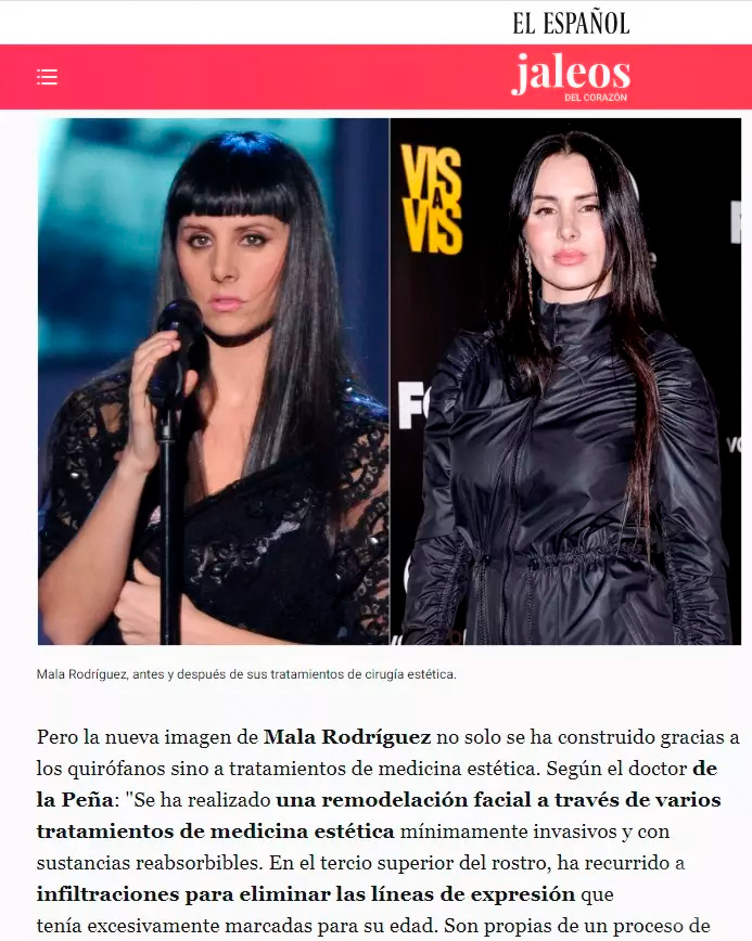 “Pero la nueva imagen de Mala Rodríguez no solo se ha construido gracias a los quirófanos sino a tratamientos de medicina estética. Según el doctor de la Peña: “Se ha realizado una remodelación facial a través de varios tratamientos de medicina estética mínimamente invasivos y con sustancias reabsorbibles. En el tercio superior del rostro, ha recurrido al tratamiento de rejuvenecimiento facial para combatir las líneas de expresión que tenía excesivamente marcadas para su edad. Son propias de un proceso de envejecimiento acelerado o prematuro. Ocurre cuando los pacientes tienen un estilo de vida intenso o estresante. Con el paso del tiempo -como se percibe en sus apariciones públicas- terminaron por convertirse en arrugas dinámicas. Con el rejuvenecimiento facial ha conseguido corregir las líneas de la frente, el entrecejo y las patas de gallo. El rejuvenecimiento completo le habría costado unos 500 euros“.