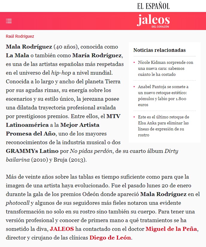 “Más de veinte años sobre las tablas es tiempo suficiente como para que la imagen de una artista haya evolucionado. Fue el pasado lunes 20 de enero durante la gala de los premios Odeón donde apareció Mala Rodríguez en el photocall y algunos de sus seguidores más fieles notaron una evidente transformación no solo en su rostro sino también su cuerpo. Para tener una versión profesional y conocer de primera mano a qué tratamientos se ha sometido la diva, JALEOS ha contactado con el doctor Miguel de la Peña, director y cirujano de las clínicas Diego de León”.