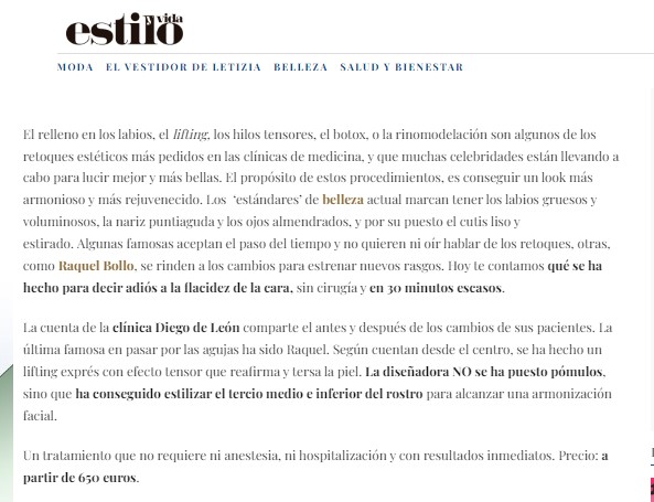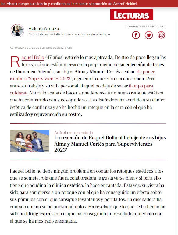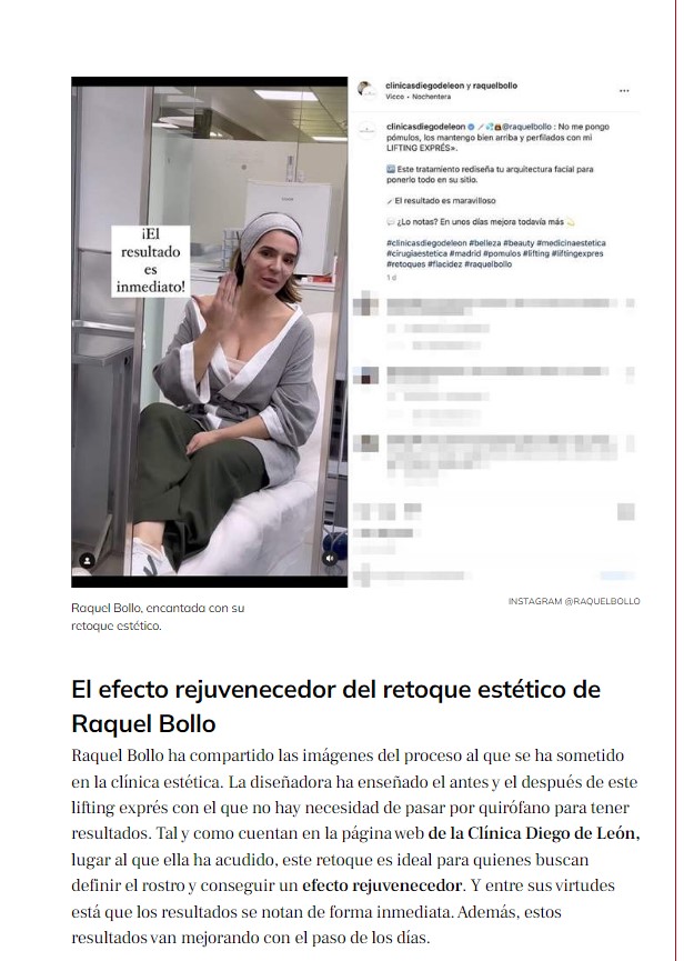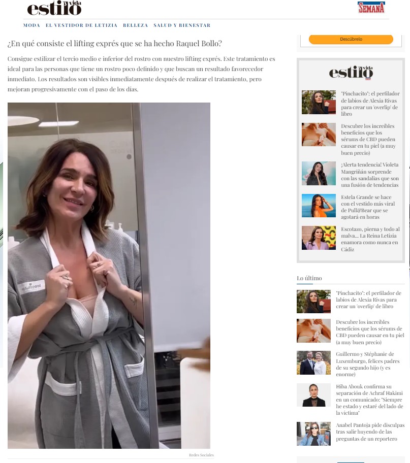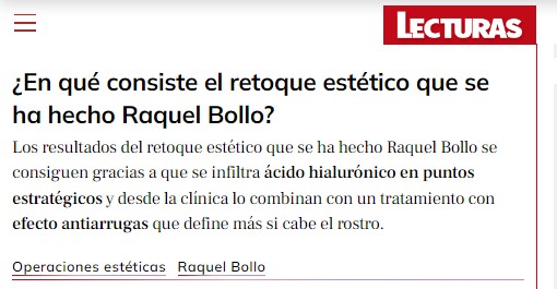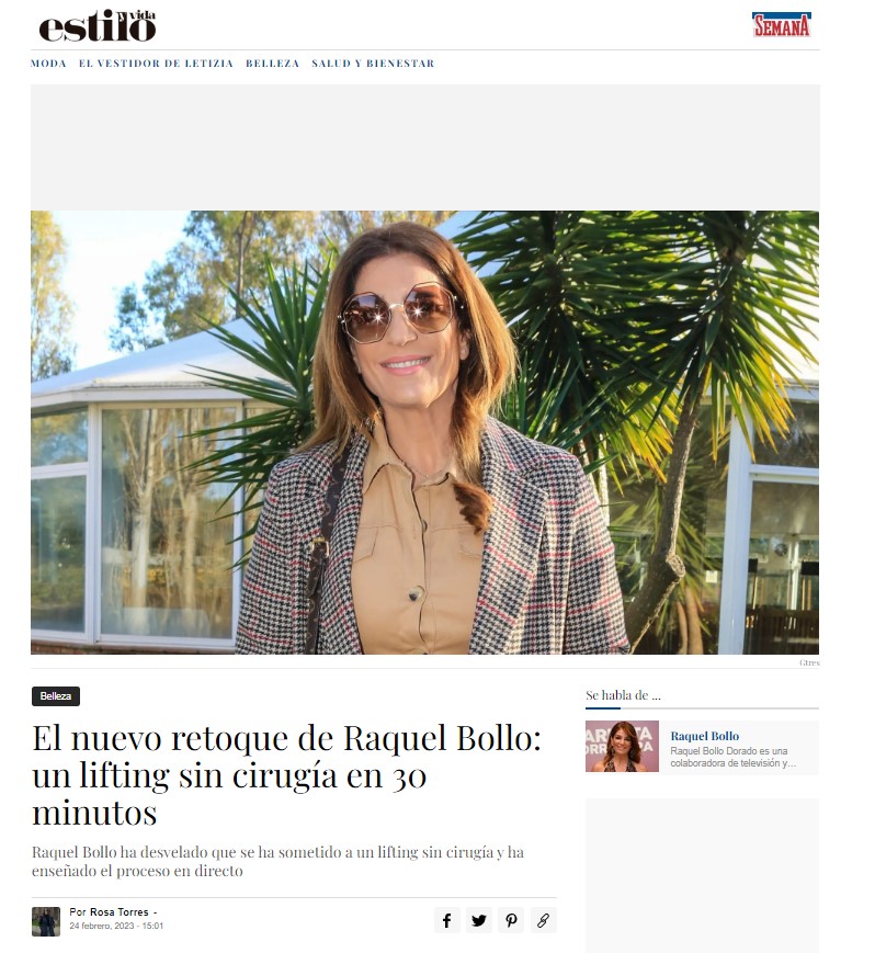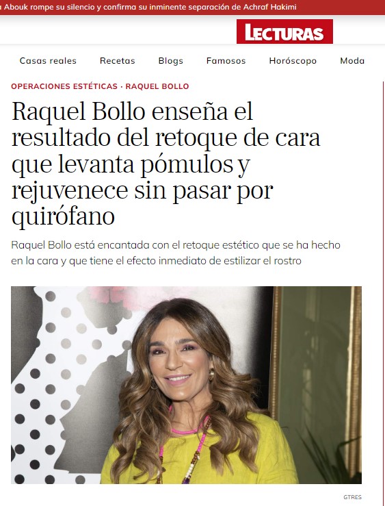 En LECTURAS y SEMANA: Raquel Bollo enseña el resultado del retoque que levanta pómulos y rejuvenece sin pasar por el quirófano Pide cita LECTURAS: Raquel Bollo enseña el resultado del retoque de cara que levanta pómulos y rejuvenece sin pasar por el quirófano SEMANA: El nuevo retoque de Raquel Bollo: un lifting sin cirugía en 30 minutos