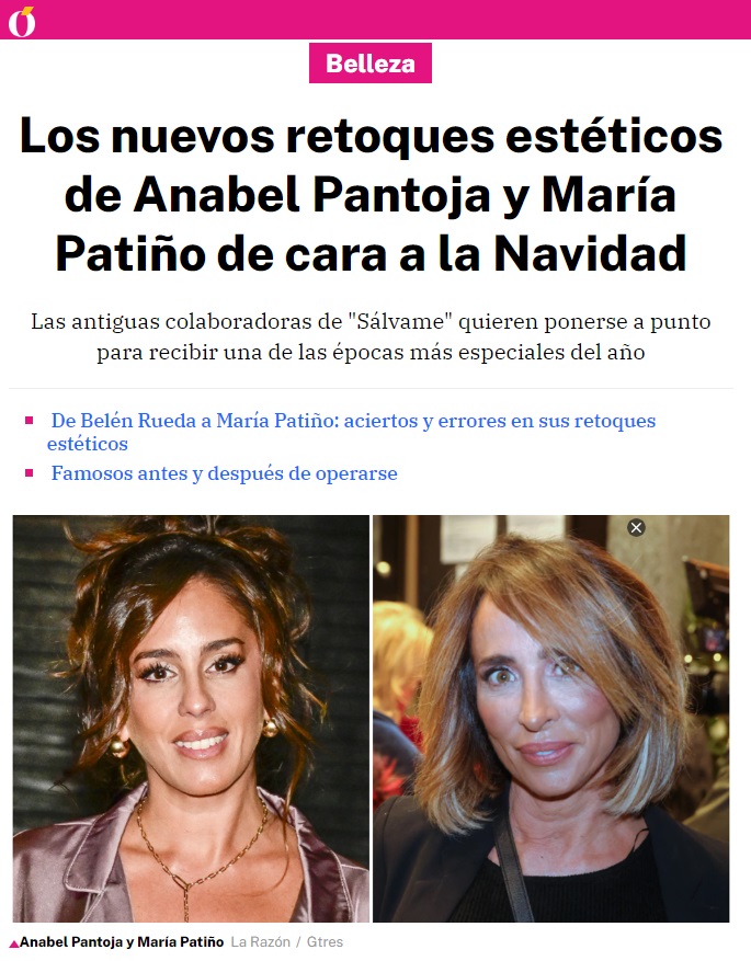 En LA RAZÓN: Los nuevos retoques de Anabel Pantoja y María Patiño de cara a la Navidad Pide cita LA RAZÓN: Los nuevos retoques estéticos de Anabel Pantoja y María Patiño de cara a la Navidad